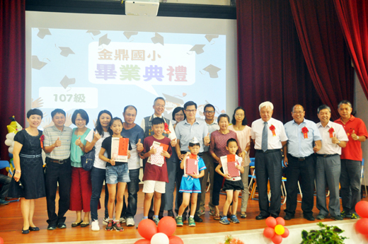 金鼎國小昨(二十)日舉行「金鼎國小部六十七屆暨幼兒部四十二屆畢業典禮」(如圖),全校師生共同歡送應屆畢業生,典禮中來賓受邀頒發成績優良等獎項,並勉勵期許畢業生,要心懷感恩惜緣,勿忘母校;學習掌握趨勢,認清方向;不斷學習,做好準備。典禮也舉行藝文成果展,進行各班才藝表演,精彩的活動與感人的氣氛,將畢業典禮營造成為人聲沸騰、一片歡樂的嘉年華。 金鼎國小一○七級畢業典禮於昨日上午八時三十分在金鼎國小學生活動中心舉行,由校長蔡雪芳主持,金門縣政府參議翁自保、省府秘書長翁明志、金寧鄉長陳成勇、金寧鄉民代表會主席陳成泉及代表李正騰、翁明惠、辛愛華、盤山村長翁明海、金鼎國小校友會理事長陳滄江議員、金鼎國小家長會會長與轄區國中小校長等人,與學生家長們一起祝福學子結束國小、幼兒園階段的學習,祝福學子順利畢業。 縣政府參議翁自保代表陳縣長來參加母校畢業典禮,並表示金鼎國小近年來在蔡校長領導下,不只學校校務蒸蒸日上,並爭取經費來建設校區,如今北側教室已經動工興建,陳縣長也感念學校資源不足,也投資七千多萬元來改建教室,並增購一塊土地讓興建教室更寬廣,沒有校長爭取就沒有今天成績,沒有縣政府支持,夢想也無法圓夢。同時勉勵同學要做大事、做大人物,把小事兢兢業業地做,具體地做,最後就水到渠成,成就了大事。而平凡人只要做了大事就能成就大人物。但成就大人物也應具備有好品德、不氣餒、永不服輸的精神就能成名。鼓勵小朋友凡事不要妄自菲薄,每人都可成為大人物,只要把本身工作做好,希望大家一起努力來打拚,成就大人物。對於幼兒園的未來主人翁,他也期望一定要好好長大。 典禮中也邀請來賓頒發「金門縣政府一○六年度應屆畢業生縣長獎、省主席獎與議長獎」、「國小部、幼生畢業成績優良獎」、「至德獎助學金」及「健康三冠王」等獎項,畢業生們獻上花束給校長、班導師,感謝師長的照顧與教誨。在校生也帶來才藝表演的節目,為畢業生們獻上了最大的祝福!