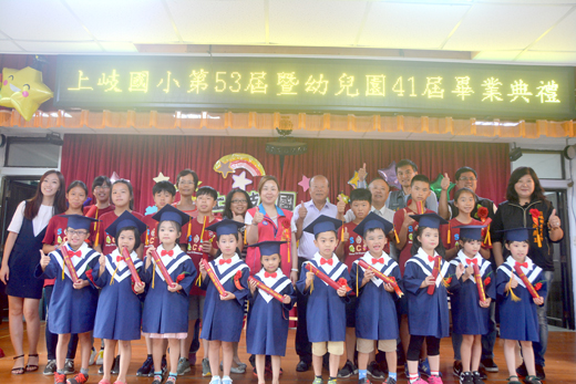上岐國小106學年畢業典禮,烈嶼鄉長洪成發等各界來賓祝福校長謝華東和國小六年級學生、幼兒園小朋友一起退休畢業。稱讚謝華東校長和教師用心發展多元教育的工作,塑造出上岐藝術學校的特色。最特別的是學生跨領域美感課程微電影首映,分享小朋友巡禮村莊故事文化的點滴,並與自己的家鄉互動。 畢業典禮於昨日上午九時舉行,鄉長洪成發、縣府教育處副處長陳家輝、鄉代會主席洪若珊、副主席洪燕玉、鄉代表吳福全、陳秀治、方駿洋、縣府烈嶼服務處主任洪植芳、立委楊鎮浯烈嶼服務處主任洪學文、國民黨烈嶼服務站主任林宜蘭、烈中校長黃明森、卓環國小校長余鳴、西口國小校長蔡志隆、烈嶼慈幼會長余平禧、議長洪麗萍烈嶼服務處林長征、上岐國小家長會長洪育政、退休校長王先勝、洪天佑、陶藝家王明宗以及各界來賓到場表達祝福,受到校長謝華東和師生的歡迎。即將接任上岐國小校長謝奕龍以及即將接任柏村國小校長的許雪芳也到場參加,感受上岐小而精、小而美、師生和家長融合的氛圍。謝華東很感謝來賓和家長會、家長參與的熱絡,活動現場人氣十足。 來賓應邀頒發畢業生個人績優獎、小鐵人獎與金頭腦獎、學校三項發展特色教育認證證書,以及全縣英語單字成就評量優秀獎,來賓很肯定上岐致力發展多元教育,鼓勵多元活動,提供學生發揮潛能的舞台,激發小朋友的自信心。烈嶼慈幼會長余平禧頒發慈幼會獎學金、家長會長洪育政也頒發家長會特別獎,鼓勵畢業生繼續創造佳績。 校長謝華東頒發畢業證書予六年級和幼兒園畢業生,滿滿的祝福在新的學習階段,有更好的發展。謝華東也為他近四十年的公職、教職生涯劃下圓滿的句點。來賓們祝福提早退休的謝校長,新的人生規劃,有更精彩的生活。來賓稱讚謝華東服務上岐國小四年來所做的努力和成果,塑造出上岐藝術學校的特色。家長們更是感謝謝校長的付出,帶領教師團隊認真教學,讓家長看到了孩子在學業、技藝、藝術以及體育的豐碩成績。 活動中也穿插小朋友的節目表演,每一班的在校生輪番登台,表達對學長、學姊的祝福,天真無邪的話語,增添活動的溫馨氛圍。午間,全校師生和來賓、家長一起在校園享用學校午餐,謝華東感謝各界的支持,讓上岐發展學校的特色教育。