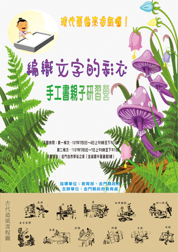 你知道紙是如何製造的嗎?書是如何製成冊的嗎?為推動美感教育,豐富文化多元生活體驗,增進社會美學推廣;推動書香社會,提高全民參與閱讀興趣,增進親子情感,養成家庭共同閱讀的好習慣。由教育部指導、金門縣政府教育處主辦的「編織文字的彩衣—親子造紙暨手工書研習營」,將於7月假自然學友之家(金城國中圖書館三樓)舉辦二梯次的活動,第一梯次7月2日至7月4日、第二梯次7月5日至7月7日,對象為國小一年級至國中二年級學生暨家長,每梯次招收50名(親子一組以一名計)。報名期間自即日起至29日止。報名請在上班時間,報名電話082-372190,林先生。 為倡導閱讀,響應資源回收,推動腦力激盪,親自體驗如何親手造紙的樂趣,分享造紙的古老技術,親手製作是項古老的手工書藝術風采,結合藝術與生活智慧,金門縣政府教育處於7月主辦兩梯次的親子造紙暨手工書研習營。漢以前將文字書寫在竹簡、木片、絲帛上,就保存或取得上有許多不便。蔡倫改進了東漢時的造紙技術,擴大了造紙原料的來源,把樹皮、破布、麻頭和魚網這些廢棄物品都充分利用起來,降低了紙的成本,尤其是用樹皮做原漿紙的先聲,為造紙業的發展開闢了廣闊的途徑。他將古代造絲紙和造樹皮布紙的兩種工藝整合起來,以造絲紙工藝的製紙工法,結合造樹皮布紙工藝的材料學知識,從動物性材料(蠶絲)改為轉用植物纖維(漁網、木料)來造紙,遂得到便宜、好用的「真紙」,時人名之曰「蔡侯紙」。以現代的說法來看蔡倫造紙,就是廢物利用、資源回收。 將紙張裝訂成冊就成為書,常見的裝訂形式為騎馬釘、膠裝、線裝。騎馬釘簡單來說就是用釘的方式將紙張用釘書機釘在一起,雜誌常用此方式;膠裝是將紙張切平,用專用的糨糊塗在邊上,並一同把書背黏在一起,現代書籍或雜誌多用此方式;線裝則常見於中國古籍,在紙上鑽出孔,再用線密實縫合書頁。看著紙張從手中成形,然後成為一本獨一無二的書冊,暑假就請全家一起來參加這個有意義的活動吧,一起寫下親子的夏日日記。
