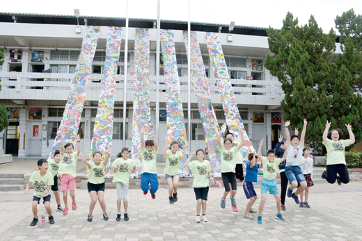 畢業季節,金湖國小暨附設幼兒園一○七級畢業典禮於日昨舉辦時,「時光之河」畢業裝置藝術美展也在學校中庭廣場內登場亮相,期使畢業生擁有一個離情依依的「美」好回憶,更讓學生家長和貴賓為之眼睛一亮,讚賞不已! 湖小「時光之河」畢業裝置藝術作品的策展人湖小教務主任楊玉蘭、畫展指導老師蔡佩格;其整個作品相當的亮眼,縱跨在教學大樓的地板至二樓樓頂的牆面上,展現湖小孩子運用多元素材,將成長的點滴回憶或是天真的願望,轉化成精彩的巨型長幅作品,也呈現出畢業生快樂且繽紛的童年,湖小歡迎家長鄉親一同到校園欣賞畢業生的作品。 從湖小川堂緩步走進校園,印入眼簾的就是「時光之河」這六條長達十一公尺的巨型畫作,從教學大樓屋頂垂降到地面,畢業生在畫布上進行彩繪,運用想像力,畫出小學六年生涯中和同學共同經歷的奇遇冒險。而且,俯瞰畫上滿是色彩繽紛、幽默輕快、熱鬧非凡的「可愛塗鴉」,讓觀賞者不禁莞爾一笑,心情也隨著畫作進入到想像的國度,遨遊在無憂無慮的童趣世界中。 策展人湖小教務主任楊玉蘭表示,今年度「時光之河」畢業裝置藝術美展,是要向西洋藝術大師「米羅」致敬,米羅是當代最偉大的畫家之一,他的畫充滿了詩意與童趣,深受大人與小孩喜愛。 楊玉蘭說,上視覺藝術課時,孩子們透過對米羅畫作觀察、畫家生平影片介紹,瞭解米羅創作的時空背景、畫中的元素所代表的意涵,透過討論萃取出米羅最常用的符號、色彩,像是紅、黃、藍、綠、橘、黑這幾種顏色,以及各式各樣的圖像符號。 在各組同學相互討論,把自己想像成特有、奇異的生物,和夥伴們一起到外太空、海底世界、火山懸崖邊、顯微鏡下的世界中……發揮想像力和同學們來一場畫布上的冒險犯難,也借此回憶過往6年和同窗好友相處的甜蜜時光。 金湖國小校長陳為信表示,金湖國小歷年皆會舉辦畢業美展來歡慶畢業典禮,像是「揚傘起飛」、「記憶時空瓶」等畢業美展活動,獲得師生、家長、社區民眾一致的好評。今年以「時光之河」為主題搭配畢業歌曲「啟程」,營造出「時光之河,捲起回憶;畢業慶典,滿載祝福;迎風啟程,馳騁天涯」的畢業氛圍。 此外,金湖國小校長陳為信說,「時光之河」也要凸顯孩子的回憶與夢想、師長的勉勵與祝福,讓湖小的孩子有快樂、溫馨的畢業回憶。另,陳為信也期望大家都能撥冗蒞校欣賞「時光之河」畢業裝置藝術美展,並藉此與家長、社區做最好的連結,營造一個美感、友善的校園氛圍。
