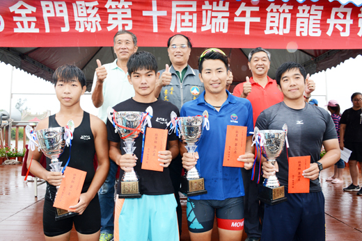 經過一天水上的拚博及在雨中的奮戰,二○一八金門縣第十屆端午節龍舟競賽各組成績昨天揭曉,金門農工A奪得社會男子組冠軍、社會女子組由金門農工C摘下冠軍、地主隊金寧鄉拿下鄉鎮組冠軍,與各組得獎隊伍,均由縣府教育處長李文良、金寧鄉長陳成勇、古寧頭雙鯉古地關帝廟管委會主委李開陣頒獎表揚,龍舟賽也劃下圓滿句點。 金門縣第十屆端午節龍舟競賽昨(十八)日假金寧鄉的古寧頭雙鯉湖舉行,總共有社會男子組、社會女子組及鄉鎮組的廿支龍舟隊下場比賽,競爭賽況頗為激烈,爭奪各組冠軍寶座和獎金。 端節龍舟賽賽程,鄉鎮組賽程第一輪分組計時,第二輪分組計時,總成績以前兩輪成績合併算排名冠軍、亞軍、季軍、殿軍。社會男子組賽程,第一輪分組計時(抽籤決定順序),第二輪分組計時(依第一輪成績一至十排序),(前兩輪成績合併計算取前八名進第三輪);第三前兩輪合併成績第一名至第四名爭冠軍、亞軍、季軍、殿軍,前兩輪合併成績第五名至第八名爭第五名至第八名。 另,社會女子組賽程,第一輪分組計時(抽籤決定順序),第二輪分組計時(依第一輪成績一至六排序)、(前兩輪成績合併計算取前六名進第三輪),第三輪前兩輪合併成績第一名至第四名爭冠軍、亞軍、季軍、殿軍,前兩輪合併成績第五名至第六名爭第五名至第六名。 經過一天各組各輪比賽,金門縣第十屆端午節龍舟競賽於昨天下午三時三十分舉行頒獎閉幕典禮,由李文良、陳成勇、李開陣頒獎表揚,各組成績如后: ◆社會男子組:冠軍:金門農工A;亞軍:金門農工B;季軍:金酒公司A;殿軍:金酒公司B;第五名:金鯊隊;第六名:第九岸巡隊;第七名:金門大學;第八名:Fulboaters2018。 ◆社會女子組:冠軍:金門農工C;亞軍:金門農工A;季軍:金門農工B;殿軍:農工校友隊;第五名:金門大學;第六名:金好野。 ◆鄉鎮組:冠軍:金寧鄉;亞軍:金沙鎮;季軍:金湖鎮;殿軍:金城鎮。 今年的端午節龍舟競賽劃下圓滿句點,縣府教育處長李文良表示,感謝有你們的支持,且有你們的努力,龍舟競賽賽程才能順利比賽完成,雖然天氣不理想,大家還是有熱情、活躍,使龍舟賽圓滿順利。 李文良特別報告表示,陳縣長指示明年端午節龍舟競賽擴大舉辦,也將雙鯉湖場地建置得更好;另,在今年的龍舟競賽也引進台灣龍舟協會的國際裁判,並對計時做了改善,未來對賽會舉行更加科學化,讓大家可以信賴! 最後,李文良再次感謝協助端午節龍舟競賽的伙伴們,更感謝選手積極的參與及訓練,使龍舟賽十分的精彩!