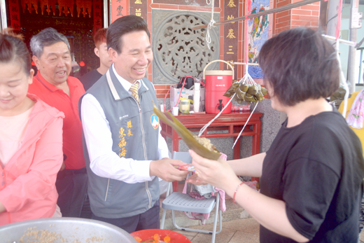 庵前社區發展協會昨日上午舉辦107年端午節包粽子聯誼活動,縣長陳福海一大早走訪多個社區,祝福大家端午節快樂。對於社區民眾應景包粽子過端午,陳縣長也致送香包袋給在場民眾,以及致贈高粱酒一打,祝福社區居民大家平安健康,端午佳節快樂。 庵前社區發展協會端午節包粽子聯誼活動,昨日上午在牧馬侯祠前戲台舉行,縣長陳福海在秘書許金象、社會處科長董燕輝陪同,向在場參與包粽子的民眾祝福端午佳節快樂,也受到社區發展協會理事長陳永祺的歡迎。 縣長陳福海也對於庵前社區活動中心興建完工,是在社區理事長與總幹事的努力奔走之下,籌得經費得以動工,肯定其對社區發展的盡心盡力,同時感謝議會的支持,讓建設得以落實。而活動中心未來不僅在硬體建設上,對於內部的軟體建設以及周邊環境維護,也一定會全力協助的,希望能將其與牧馬侯祠的地景相結合;他相信有好的活動環境,一定能夠更加凝聚社區居民感情。
