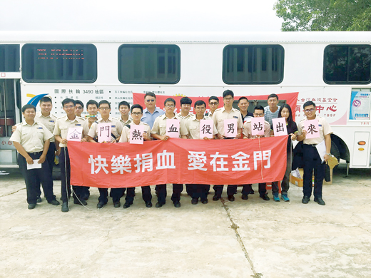 「捐血一袋‧救人一命」是大家耳熟能詳的口號,地區教育替代役男身體力行,將口號落實為行動,本月初台北捐血中心再度來金,展開巡迴捐血活動,地區教育役男在教育部金門縣聯絡處的號召之下,約有二十位替代役男們挽起袖子,捐出一袋袋熱血,為地區貢獻一份心力。 台北捐血中心日前再度來金門辦理捐血活動,並且巡迴金門各鄉鎮設點,其他諸如縣警局、金酒公司、金門大學等單位也響應,而金防部則是設點在金湖士校路的金門幹訓班當中,不少國軍弟兄紛紛響應捐輸熱血,地區教育替代役男們也一起響應,於日前在金門縣校外會以及教育處的共同號召之下,由金門縣校外會督導張智芳、教官孫孝義、教官劉穎德、教官宋洋孝等人的帶領之下,與地區的教育替代役男前往幹訓班的捐血地點挽袖貢獻愛心。 金門縣校外會表示,捐血是一項極具意義的活動,而且為了展現替代役男們熱心公益的情操,同時擴大服務層面,藉由與台北捐血中心辦理的捐血活動,期待地區的替代役男們能夠發揮「分享健康、捐血救人」的大愛精神,發揮熾熱的愛心,挽袖捐血,為血庫注入股暖流。而捐血是相當利人利己的事情,不僅對於自身新陳代謝有所助益,捐輸出來的血液,也能用於救人的用途,是相當有正面意義的。同時,也正好發揮了替代役「愛心」的理念與宗旨。