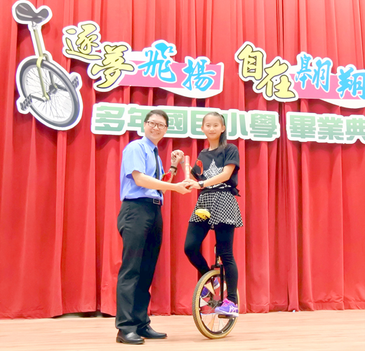 逐夢飛揚、自在翱翔!多年國小昨日舉辦國小部第56屆暨幼兒園第40屆畢業典禮,歡送18位畢業生。學子延續十多年來的傳統,六年級11位畢業生展現「獨輪」功夫,腳踏獨輪車自校長陳來添手中領過畢業證書。陳來添也以「堅持、永不間斷的學習,實現自己心目中的第一名」勉勵畢業生。 多年國小昨日假高職國際會議廳舉辦國小部第56屆暨幼兒園第40屆畢業典禮,歡送國小部11位以及幼兒園7位畢業生。縣府參議許寬、縣議員唐麗輝、陳滄江、李應文、縣府教育處副處長陳家輝、金湖鎮民代表會主席蔡乃靖、代表陳向鑫、金沙鎮代理鎮長蔡其朝、金沙鎮大洋里里長吳有泰、金湖國中校長謝志偉、金湖國小校長陳為信、柏村國小校長陳為學、正義國小校長許瑞芬、縣府督學許雪芳、科長葉麗珠、退休校長張樾、多年國小家長會會長吳天財、多年國小愛心媽媽社成員及師長和家長齊聚一堂獻上祝福。 與會貴賓頒獎勉學子並獻上祝福,由六年級林敏馨、幼兒園陳邦彥榮獲縣長獎。杏園優學獎李詠琳、杏園菁英獎林敏馨、杏園領導獎呂宥甫、杏園傑出獎葉彥廷、蔡騏鴻,杏園熱心服務獎關博元、陳隆勳、杏園樂群獎吳雲蘋、吳成駿、杏園美德獎楊翎均、杏園生命教育獎鄭庭宜。除了表揚績優學子外,校長陳來添頒發感謝狀給英語外師「Dom」;並由家長會會長吳天財代表頒發感謝狀給多年國小愛心媽媽,感謝她們的付出成為學校以及學子的後盾。 而會中除了頒獎外亦有各班才藝表演,幼兒園及六年級各班帶來精彩的舞蹈,學子粉墨登場扭腰擺臀非常可愛,也抹煞不少底片。全場齊唱畢業歌「追光者」,在校生、畢業生互道珍重。最後,在歡樂的氣氛中為典禮畫下圓滿句點。 多年國小校長陳來添表示,以「堅持、永不間斷的學習,實現自己心目中的第一名」勉勵畢業生。他希望學子能夠養成終身學習的好習慣,在人生道路上持續學習並且實現自我。
