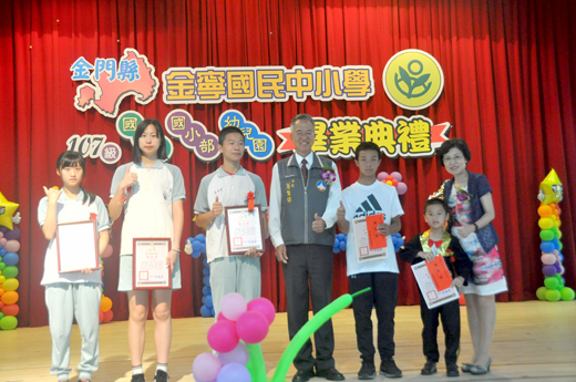 畢業季到,金湖國中昨(12)日舉辦107級畢業典禮,典禮上頒發學習領域績優獎、聖祖獎學金、勤學獎、品德達人、服務達人、藝文達人、體育達人、全勤獎等獎項,並特別頒發「體育特殊貢獻獎」給頻頻在全國體操競賽中得獎的畢業生賴金。典禮中頒發畢業證書,並由畢業生合唱畢業歌和校歌。校方也舉辦社團成果展,包括國樂社、管樂社、熱舞社、獨輪車隊等表演,最後還有壓軸抽獎活動。包括縣府秘書長林德恭、教育處長李文良、金湖鎮長蔡西湖、鎮代會主席蔡乃靖等人均出席。 今年湖中畢業典禮,特別加頒一項「體育特殊貢獻獎」給畢業生賴金,賴金是金門重點栽培的體操選手,體操實力堅強,近年代表金門參加體操賽事獲獎連連,包括參加2018摩洛哥世界中學生運動會,獲得平衡木金牌、高低槓第5名、全能第6名。參加106年全國中等學校運動會,獲得平衡木金牌、地板銀牌、全能項目銅牌、跳馬第4名、高低槓第4名。參加106年全國競技體操錦標賽,獲得高低槓第2名、地板第2名、平衡木第3名、全能第3名、跳馬第4名。參加106年全運會競技體操,獲得平衡木金牌、高低槓第5名、全能第6名。參加107年全國中等學校運動會,獲得跳馬金牌、平衡木金牌、全能銀牌、高低槓銀牌。賴金在106年便獲選進入中華奧會運動菁英育才計畫競技體操項目培訓隊,是未來極有可能代表金門站上奧運殿堂的明日之星。 其餘受獎畢業生包括,總分績優獎:謝璠、陳律涵、宋昱蓓、謝菀軒、陳妍、許云謙、李謙和。進步績優獎:呂香穎、蔡貿麒、劉子晴、廖子恩、賴金、李少騰、楊育杰、蔡其曄、洪盛塏、吳宣蓉。 各班前3名:901陳妍、黃昱、宋昱蓓;902謝菀軒、王力弘、陳秋娟;903謝璠、呂宜室、李翊熏;904許云謙、張睿杰、李謙和;905陳律涵、余星儀、何佳薰;906李易、林芊嬡、呂垣逵。 勤學獎:洪允成、劉恩廷、吳旻真、賴金、陳律涵、王芝力、陳苗錡、劉純儀。全勤獎:余星儀、謝璠、蔡宗翰、何佳薰、許云謙。單科績優,國文:陳妍、謝菀軒、李易。數學:李易。英語:陳睥兒、余星儀。社會:謝菀軒、陳律涵。自然:謝菀軒。寫作:謝礎安、謝璠。 各領域達人,品德達人:李俞萱、陳妍君、蔡宗翰、楊子毅、徐聖鈞、林育辰。服務達人:陳興瀚、吳致賢、洪安、陳芊妤、林聖偉、陳姿夢。體育達人:呂杰銘、羅尚泓、鄭祈才、鄭宇彤、楊育杰、葉修博。藝文達人:呂耕驊、張鳳竹、陳琬瑜、許嘉容、黃珮慈、陳汶君。 金湖國中校長謝志偉勉勵畢業生表示,湖中的畢業生在這一年中,舉凡語文、科展、藝文、體育及生涯探索等領域均有亮眼的成績展現,在活潑的校園氛圍,搭配多元的學習舞臺,自信的臉龐綻放於各教學、競賽、表演的場域,湖中師長陪伴著每位優質湖中人成長、茁壯。謝志偉強調,湖中的同學個個身懷絕技,在各領域均有自己的優勢能力,將此優勢能力複製在未來人生的各場合,自信地展現專業,自信的人,改變了自己。在人生路上,與師友多方請益,用正確的態度,堅持自己的方向,深信:所有對生命的堅持,都會在時間的河流中看見成長,堅持的人,改變了命運。謝志偉期盼每位湖中的莘莘學子充滿自信與堅持,飛揚在社會各角落,貢獻世界。