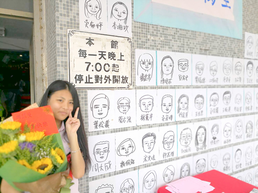 李增汪/圖文 從小喜歡在筆記本和書本塗鴉的金城國中應屆畢業生周苡曼,昨天在畢業典禮很受矚目,因為她用人像速寫了學校一百二十位老師的大頭照,就醒目的陳展在城中體育館入口兩側,讓學校師生驚艷,也表達對母校師長的懷念。