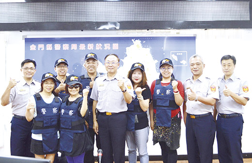 慶祝警察節,金門縣警察局舉辦「媒體一日警察體驗營」活動,邀請媒體朋友實地參與警察勤務內容,真實感受警察工作的難處與辛勞,並進一步透過報導讓民眾有正確的認知,更支持警政工作,共創多贏局面。 金門縣警察局首次辦理的這項體驗營活動是12日下午2時展開,包括地方及中央駐金媒體記者朋友參加,受到警察局局長劉耀欽、副局長張俊揚、主任秘書黃主文、督察長陳膺方及主管的熱烈歡迎。 為能讓媒體朋友了解警察平日工作態樣,本次活動縣警局精心規劃了「觀看警察執行勤務影片、體驗穿著防彈背心」、「警察駐地應勤裝備及設施簡介」、「保安裝備展示、體驗鐵拒馬架設」、「科技偵防及鑑識」、「路檢勤務」及「員警體技實務訓練」等項目,各項行程安排都與警察維護勤務有關。 在媒體朋友抵達縣警局後,首先是體驗穿著又厚又重(約五公斤)防彈背心在該局3樓勤務指揮中心會議室觀看警察勤務相關影片及監錄系統之運作。 縣警局局長劉耀欽致歡迎詞表示,媒體朋友是民眾的良心鏡,忠實反映及傳達社會實情,此次藉由媒體朋友實地參與警察勤務內容,能更加了解警察工作辛勞及真實的一面,除增進彼此之間互動及情誼,也能透過未來的報導讓民眾有正確的認識,進而了解、支持警政工作,共創多贏局面。他也感謝記者、媒體朋友們長久以來對於金門縣警察局團隊的支持與愛護。 接著前往金城分局,由曾任高雄市特勤中隊長的郝心誠分局長親自引導參觀留置室,並解說各項警用裝備,並以該分局受理車禍肇逃案件作為模擬狀況演練,讓媒體朋友了解受理報案、調閱路口監視器等相關作業流程。隨後接著前往金寧分駐所讓媒體朋友親身體驗處理聚眾活動時需穿著保安裝備、盾牌等,並體驗鐵拒馬如何架設及使用情形,也讓媒體朋友了解,保安裝備在執行聚眾活動勤務時是可以保護員警執勤安全,另鐵拒馬在使用上能有效隔離及阻擋人車的作用。