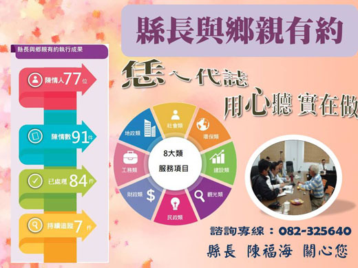 由縣府民政處主辦,每月第二週星期二下午14時起﹐在縣府大禮堂推出的縣長「與鄉親有約」活動,六月份因適逢「萬安演習」,原訂5日(星期二)的「親民日」﹐將提前於6月4日舉辦。陳縣長將率各局處首長聆聽群眾心聲,一起來面對面問題,討論解決問題。 陳福海表示,鄉親的問題「刻不容緩」,同仁應以「同理心」協助民眾解決問題,「『恁ㄟ代誌』嘛是『阮ㄟ代誌』」,施政沒有先後,更沒有歷史遺留,舉凡從軍管時期、安輔條例、都市計畫到民生等各項問題,民眾都須仰賴政府協助,在不違反法律之前提下,應確實考量「公益」與「私益」之衡平性,研議可行之替代方案,用以解決困擾鄉親許久、沉痾難解的問題。 縣府表示,「縣長與鄉親有約」系列活動,獲各界矚目,縣長為體察民意,將逐一接待鄉親,聽取陳訴,現場答覆。為服務更多鄉親,各場採現場報到取號之方式,請鄉親於活動時間內(下午16時前)在縣府服務台﹐填具服務摘要後﹐以報到時間,依序領取號碼牌,於活動開始(14時)引導入場。 縣府強調,如有具體訴求需縣府協助處理之案件,除現場交換意見初步回應外,將製成紀錄,會後交由各業管單位研處後,再以公文書正式函復陳情人。