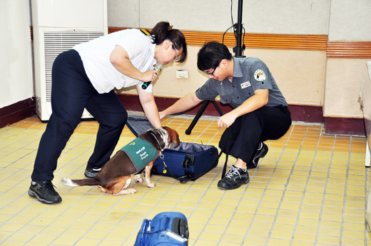 金門縣動植物防疫所舉辦「銷毀緝獲之走私畜禽及其產品計畫宣導活動」,現場實地示範檢疫犬在機場如何檢查旅客行李,一隻檢疫犬在每一個行李箱旁聞了幾下後,便在其中一個行李箱旁坐了下來,打開行李箱,果真裡面有蘋果,嗅覺十分靈敏,模樣可愛。 由行政院農業委員會動植物防疫檢疫局指導、金門縣動植物防疫所主辦之「銷毀緝獲之走私畜禽及其產品計畫宣導活動」,活動內容包括貴賓致詞;致贈金門地區查緝機關及本局委託縣市執行機關禮品,感謝協助查緝業務及後續銷毀業務;金門檢疫站檢疫犬隊模擬執行入境旅客攜帶行李檢查作業;業務分享及有獎問答。 令人眼睛為之一亮的是,現場請來一隻檢疫犬實地示範檢疫犬在機場如何檢查旅客行李。由一名隊員牽著檢疫犬,一一聞過每一個行李箱,檢疫犬的鼻子十分靈敏,即使隔著行李箱的外殼,還是有辦法聞出行李箱內是否裝有水果等違禁品。昨日現場準備5個行李箱,其中1個裡面裝有蘋果,檢疫犬在每一個行李箱旁聞了幾下後,便在其中一個行李箱旁坐了下來,「坐下來」這個動作就是代表牠有聞到「東西」,於是打開行李箱,果真裡面有蘋果。之後再度示範由旅客拉著行李箱走動,即使行李箱是在移動的狀態下,檢疫犬仍然有辦法辨認出「有異味」的行李箱。 檢疫犬隊人員表示,檢疫犬們都受到良好的待遇,每年都會固定幫這些檢疫犬安排健康檢查,平時也會幫牠們除寄生蟲,餵食狗糧或零食,只不過不會餵食生肉,因為會影響其工作上的嗅覺敏銳度。 金門縣動植物防疫所表示,有鑑於國際重大惡性動物傳染病疫情(高病原性家禽流行性感冒、口蹄疫及狂犬病等)陸續於鄰近國家發生,唯恐動物傳染病藉由走私管道傳入我國,造成國內畜禽業者及我國農業環境巨大損失,甚至無法永續發展。行政院農業委員會動植物防疫檢疫局與查緝機關合作,並委託台灣本島及離島縣市,儘速協助查緝機關緝獲沒入之走私畜禽及其產品進行銷毀處理工作,為表達政府打擊走私嚴懲不法之決心,以防範走私動物及其產品,杜絕海外動物傳染病入侵,特辦理本活動。 宣導講座邀請包括金門縣政府、行政院海岸巡防署、海巡署中部地區巡防局第九(金門)海巡隊岸巡第九總隊金門機動查緝隊、財政部關務署高雄機場分關、福建金門地方法院檢察署、金門縣動植物防疫所、雲林縣動植物防疫所、澎湖縣家畜疾病防治所、連江縣政府、本局動物檢疫組及高雄分局(金門檢疫站)等單位人員參加。