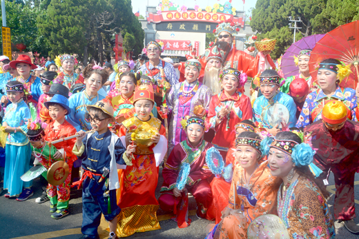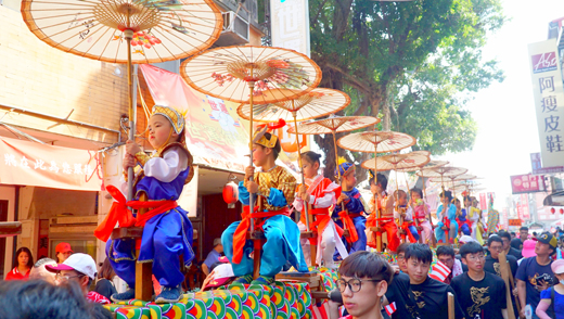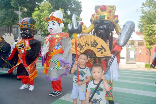 許峻魁/圖文 蜈蚣座,是每年迎城隍隊伍中最為吸睛的,小朋友們粉墨登場,各個化身為古裝人物,相當逗趣可愛,有皇帝、仙女、文臣武將的裝備,沿途民眾快門按不停。 而昨日氣候炎熱,小朋友們也非常敬業,手持著小風扇消暑,跟著遊行隊伍完成繞境,也為自己留下難忘的經驗。