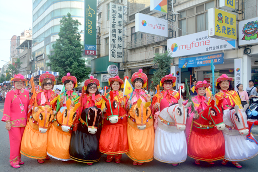 許加泰/圖文 浯島邑主城隍遷治338週年慶典的巡安大遊行,除了城隍爺專屬陣頭,各式各樣的陣頭也共襄盛舉。金城鎮南門天后宮布馬陣頭,人身獸體,即上半身為人,下半身為獸,表演出不同的動作,是個十分有創意與特色的民俗技藝。 布馬陣的表演看似有如小朋們常玩的騎馬遊戲,表演者融入其情境,表演出不同的動作,很吸睛。