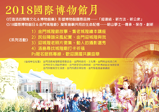 518國際博物館日尬上金門城隍爺!金門文化園區管理所策劃2018國際博物館月活動,用「超連結博物館,新方法,新公眾」連結行銷金門「四月十二迎城隍」,規劃《朝山夢土系列-迎城隍》主題,包括,尬上金門迎城隍,民俗陣頭采風紀實,遇見城隍爺耆老說故事、尋找城隍廟打卡祈福等,歡迎民眾參與。活動洽詢專線082-351030,最新訊息可至文化園區首頁http://culturalpark.kinmen.gov.tw/index.php下載及查詢。 《金門迎城隍》登上國際博物館月,文化園區啟動五項活動,形塑金門閩南文化。金門文化園區管理所以「超連結博物館,新方法,新公眾」型塑及連結行銷金門重點民俗慶典「四月十二迎城隍」主活動,擬定《朝山夢土系列-迎城隍》主題,並藉以串聯金門浯島城隍廟管理委員會總體活動及各級單位、主管社團等協助下,啟動五項系列活動。 金門縣文化園區管理所表示,迎城隍信仰是「金門土地上共同的生命記憶」,也是最具影響力及代表性的無形文化資產之一,更是金門常民自古以來,人神信仰中共同守護土地重要的感情力量與生命記憶,故園區首次將「金門城隍爺」與「國際博物館」對接,讓金門迎城隍連結國際博物館月舞台,藉以讓金門特有民俗活動與世界接軌,串聯在地文化資產,深耕閩南文化,提升文化認同與大眾參與,達到資產活化與文化永續目標,也落實縣政「活的閩南文化博物館島」為願景。並且透過文化傳習、保存、活化發揮博物館友善、親和力與社會傳播力與社會共融發展,打造金門閩南文化名片,讓金門接軌國際文化品牌。 金門文化園區管理所,518國際博物館日,《朝山夢土系列-迎城隍》主題活動,由金門縣傳統民俗藝陣團體及閩南文化協會、金門縣攝影協會、風獅爺童書館等在地藝文社團協力同步推出,內容包括:「金門城隍爺故事」與「金門耆老話城隍」繪本講座、「民俗陣頭采風紀實」及「金門迎城隍與我」、「城隍巡安憶舊老照片徵集」、「迎城隍動人的瞬間攝影選秀」、「浯島尋找城隍廟打卡祈福」等五項活動,參與報名詳見下列各組服務專線,歡迎鄉親大眾踴躍參與。 (一)《朝山夢土系列-遇見城隍爺》:繪本教育推廣與金門耆老說故事。時間5月20日(星期日),下午14:00至16:00,假文化園區歷史民俗博物館。邀請專業講師王欲荷、金門耆老許金印講述「金門城隍爺的故事」及「繪本說故事」帶小朋友認識金門城隍爺。參加對象以金門說故事媽媽、金門兒童等,共計一場,名額30人,即日起報名專線:0931599134洽蔡小姐。 (二)《朝山夢土系列-尬上金門迎城隍》民俗陣頭采風紀實:活動透過圖文紀實金門迎城隍陣頭、尬輦(或遶境隊伍體驗),完整記錄「金門迎城隍」巡安遶境隊伍(香路),做為金門民俗文史研究及館內民俗紀實影像收藏及推廣文化與觀光、教育等建構無形資產。 (三)《朝山夢土系列-迎城隍與我》遶境巡安相關老照片徵集及出版規劃徵集過往生活中最珍惜、最具歷史性的或紀念意義的金門迎城隍的老照片(陣頭、尬輦或遶境隊伍等),不限彩色或黑白照片或電子圖檔(2M以上)。徵集收件:即日起至6月20日(一個月)。作品可先以自行翻拍送件,須為提供者所擁有或授權人同意者,以維護作品權利人權益。其珍貴性原作,可自行先複製翻拍後(手機拍攝亦可)送件參加評選即可。博物館同時將評估作品展出及出版。報名洽詢專線082-351030,亦可至文化園區歷史民俗博物館服務櫃台索取或官方網站http://culturalpark.kinmen.gov.tw/index.php下載最新訊息。 (四)《朝山夢土系列-迎城隍動人的瞬間》:發現土地的力量「2018國際博物館日-金門最神氣的城隍爺」,活動將由攝影專業組織團隊,聯手推動捕抓今年金門迎城隍中最美麗動人的瞬間鏡頭,及舉辦拍攝照片選秀賽,豐富此活動無形資產。 (五)《朝山夢土系列-尋找城隍廟打卡祈福》:接軌2018年國際博物館月活動,舉辦全島趴趴跑「尋找浯島城隍廟打卡活動」,辦法如下:1.按讚加入「金門縣文化園區管理所-金門歷史民俗博物館」臉書粉絲團。2.在(518國際博物館日系列活動-城隍廟拍照打卡)活動頁上,上傳與金門島上任2間城隍廟之清楚合照打卡,留下您對活動祝福吉祥話語,本人至歷史民俗博物館即可兌換一份精美紀念小禮品(每日限量10份,送完為止)。3.活動日期:5月20日-6月20日※遊客本人須入鏡。拍照打卡上傳網址:https://goo.gl/vFnCbE。(以上各活動資訊及異動事項敬請上歷史民俗博物館網站。(周一休館09:30-17:00)洽詢電話:082-351030-歡迎踴躍共襄盛舉。