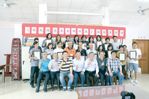 金門姓氏源流解說員訓練於日前舉行結訓典禮,由金湖鎮鎮長蔡西湖親自主持授證與頒獎。對金門深厚的宗族、宗廟文化的保存與推展,及文化觀光都有實質的助益。 才在今年三月十五日於「金門日報」與「陳景蘭洋樓」之間的「覺民堂」剛開幕《姓氏源流在金湖特展》,是金湖鎮公所活化空間資源、再造觀光資源佳作之一,也是遊客參觀陳景蘭洋樓後,可以直登覺民堂參觀閩南式宗祠建築、金門謁祖會親活動、傳統姓氏族譜展示。金湖鎮公所觀光課基於展場解說服務與管理維護,特於合約中增列解說管理教育訓練計畫;為了方便鄉僑返鄉訪親尋根,要求承攬單位││金門縣宗族文化研究協會配合「假日駐點協助計畫」,立意深切。 本次《姓氏源流在金湖特展》解說員訓練已於四月十四、十五日與廿一、廿二日在正義里公所二樓舉辦,每天上課六小時,共計廿四小時。授課內容在宗族活動方面有黃奕展主講的迎五安祖、陳順德主講的碧山與深滬交流經驗、蔡清其主講的金門迓端明祖活動;在金門氏族方面有蔡清其主講的金門蔡氏宗族與鄭藩派主講的滎陽鄭氏與金門、呂媽定主講的金門呂氏春秋、陳榮文主講的金門十三陳;在宗族經營方面有黃奕木主講的宗族資產經營活化之財稅管理實務;在宗族儀禮有陳木漳主講的金門奠安祭祖儀式與黃獻煜主講的金門的宗族活動;在宗祠文化方面有許志仁主講的金門宗祠牌匾解讀與葉鈞培主講的金門各姓家廟族譜普查成果、蔡鳳雛主講的村名與姓氏、王建成主講的金門宗祠建築;在先人住所方面有陳炳容主講的金門古墓;在族譜方面有郭哲銘主講的譜牒在鄉土研究的應用與黃奕展主講的族譜修譜原則;最後由陳榮文對覺民堂佈展與管理維護作講解。 參與本次訓練的學員有陳景蘭洋樓駐點解說員、領有導遊證的導遊、對宗族文化有興趣的素人、民宿的經營管理者。每天的綜合討論是最熱鬧的時刻,大家的經驗分享,凝聚在宗族與宗祠的文化,使每人收穫良多,為了使大家能共同在這一主題不斷的精進,更在LINE中組成群組。結訓典禮由金湖鎮長蔡西湖親自主持授證與頒獎。