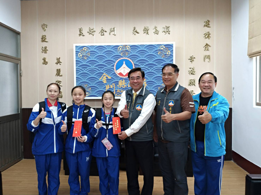 經過層層的選拔後,金門縣體操選手黃子星、賴金將代表國家赴摩洛哥參加「2018年世界中學生運動會」,為鼓勵這兩位優秀選手,副縣長吳成典昨特別代表陳福海縣長以金門縣名義致贈程儀,希望她們能全力以赴,為國、為縣、為金門爭光。 縣府教育處指出,世界中學生運動會,是一項限13歲至17歲在校中學生參加的國際綜合性運動會。這項賽事,1990年以前每兩年舉辦一屆,1990年後改為每四年一屆,由國際中學生體育聯合會(International Schoolsports Federation)主辦。首次世界中學生運動會于1974年在德國的威斯巴登舉行。2018年世界中學生運動會則將於5月2日至5月9日於Marrakech/Morocco(馬拉喀什/摩洛哥)舉行。參加此盛會是中學生的夢想。 教育處處長李文良表示,目前就讀於金湖國中的賴金、黃子星同學,兩人體操實力堅強,106年9月便入選中華奧會運動菁英育才計畫競技體操項目培訓隊,由中華奧會主席林鴻道自掏腰包2000萬台幣,從國內8至18歲的潛力體育新秀中,挖掘出具有奪牌潛力的好手,往下扎根,希望能在2024年奧運收到成效。賴金和黃子星是未來極有可能代表金門站上奧運殿堂的明日之星。 甫在全中運體操項目中大放異彩的賴金和黃子星,昨啟程代表國家赴摩洛哥參加「2018年世界中學生運動會」,行前,她們在教育處安排下,由教練梁萍和黃宗瑞陪同抵達縣府,副縣長吳成典特別代表陳福海縣長致贈程儀,鼓勵她們能全力以赴為國為縣為金門爭光,也期待2位小選手在站上奧運殿堂前,藉著此次競賽的砥礪和磨練,將整體競技體操技術再提升,為金門爭取更高的榮耀。