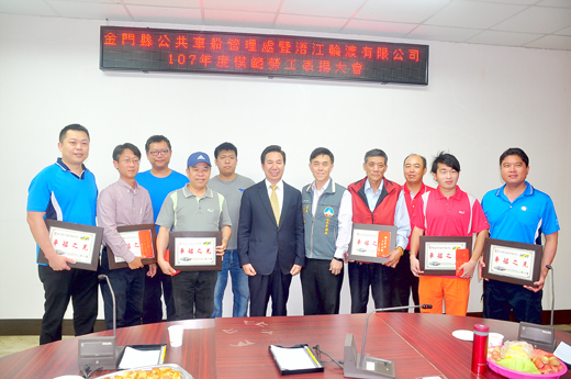 今日是五一勞動節,車船處暨經管浯江輪渡有限公司,為慶祝五一勞動節,於昨(30)日下午表揚模範勞工,包括車運、船運及小三通部門,表揚人員包括:薛逸璞、呂謝志業、何永存、陳士捷、葉鵲鳳、黃繼正、洪添榮、林家宏、陳彥易等9人。由縣長陳福海及車船處長許一傑共同頒獎表揚。 縣長陳福海勉勵表示,車船處每一位同仁都很優秀,車船處和浯江公司,對金門鄉親而言,是很重要的單位,守護鄉親行的便利。陳福海同時提醒車船處同仁,平時工作崗位上開車、開船,務必做到「安全第一」。陳福海也誇讚車船處這次打造往返烈嶼的新船「金烈之星」,任務圓滿完成、做得很好,他特別勉勵所有同仁。陳福海也透露,未來也想改善車船處的環境,讓同仁們有更好的辦公環境。