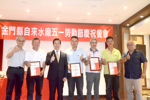 金門縣自來水廠昨日舉辦慶祝五一勞動節及表揚優秀模範勞工餐會,縣長陳福海感謝自來水廠員工所付出和努力,並肯定用心執行金門自大陸引水工程的計畫,陳縣長說,目前就等待兩岸通水的時機到來,一定會讓金門不缺水。 自來水廠107年「慶祝五一勞動節」餐會,昨日中午舉行,廠長許正芳、工會理事長翁世澤及員工共聚一堂過節。行程滿檔的陳縣長也堅持一定要到場向水廠所有辛苦員工致意和感謝。副議長謝東龍、議員陳滄江、李誠智、李應文也到場賀節。 陳縣長指出,金門大環境在改變,金門充滿希望,但大前提下,水是地方發展最基礎的事業,水廠員工扮演的角色和責任很重要,不但要讓縣民有水喝,還要喝好水,並要穩定提供金門各項建設發展用水所需。 陳縣長說,他代表金門所有鄉親感謝水廠員工的辛苦努力和付出,並祝福五一勞動節快樂。 陳縣長也肯定水廠員工用心、認真執行金門自大陸引水計畫工程,陳縣長說,目前就等待時機就通水,在水資源供應上將獲得極大改善。 陳縣長頒獎表揚水廠模範勞工鄭根文、何睿翔、方榮森、楊水固,致贈「惜福酒」祝賀,並期許繼續做好本職工作。